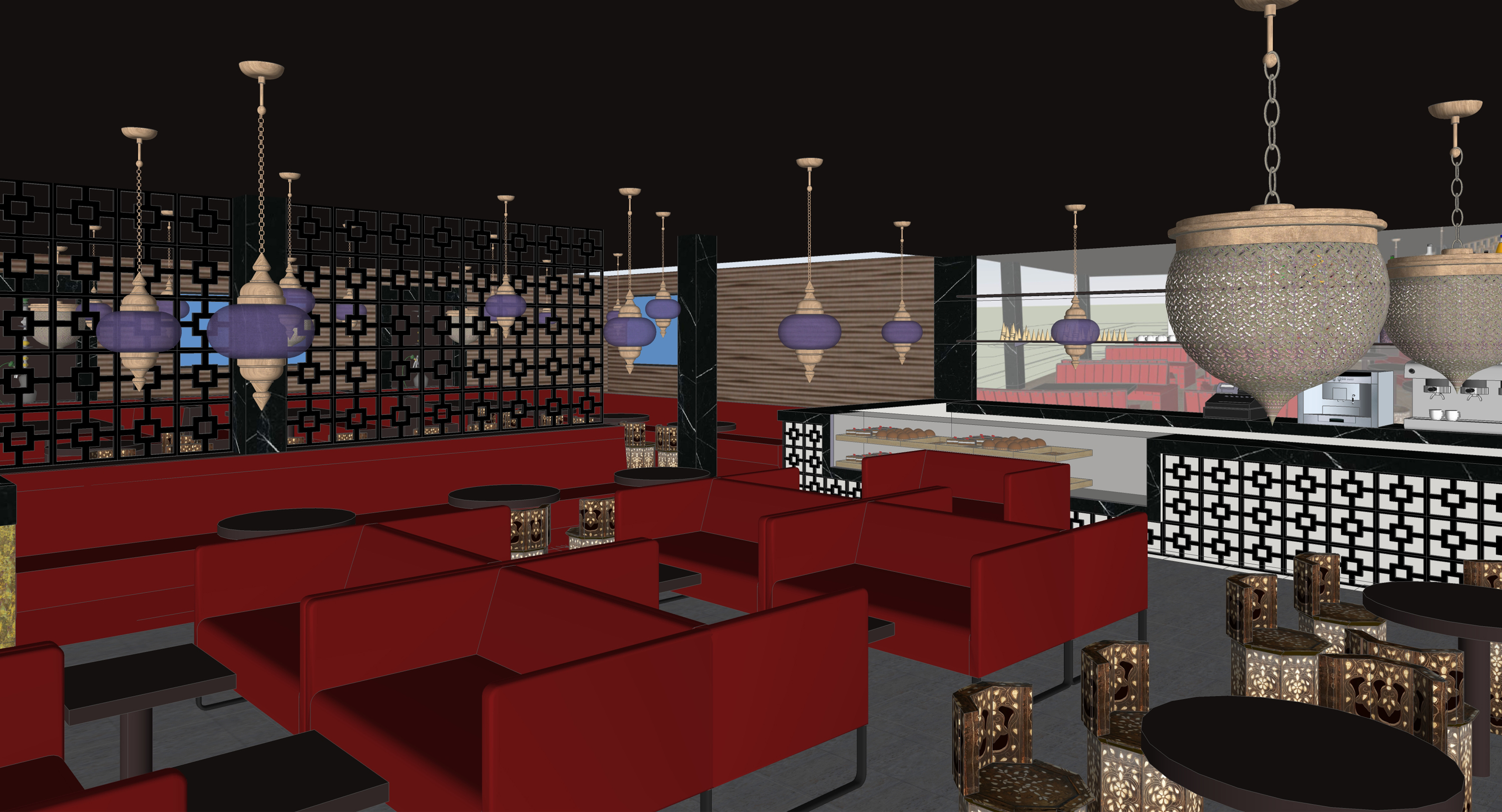 Tamara Lounge, Uxbridge - Shisha lounge, 2016. An eclectic design for a shisha lounge. Design features with Middle Eastern origins, screens, hookahs, Moroccan lights, etc combined with modern furniture creating an exciting mix. A popular destination.